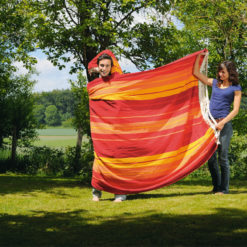 Genießen Sie die wahrscheinlich größte Hängematte der Welt und schaffen Sie in Ihrem Garten einen traumhaften Platz für die ganze Familie. Die extra fest gewebte Liegefläche bietet eine Größe von 200 x 300 cm bei einer unglaublichen Belastbarkeit von 280 kg. Die feurige Farbgestaltung in Rot, Orange und Gelb macht sie zum Hingucker in jedem Garten und sorgt für gute Laune. Hergestellt ist diese hochwertige Hängematte aus Baumwolle, die aus Schnittresten der Textilindustrie generiert wird. Das schont Umwelt und Ressourcen. Ein hochwertiges Produkt, an dem die gesamte Familie lange Freude haben wird. Die Lieferung erfolgt mit praktischem Tragebeutel.